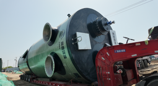 兩臺泵站筒高統(tǒng)一為7.5米、直徑分別為4.5米和3.8米,重達15噸和13噸,安裝難度非常高。我司提前勘察現(xiàn)場,確定吊裝方案。4月18號安裝當天現(xiàn)場我司安排了兩輛吊車,確保兩臺泵站穩(wěn)定就位。