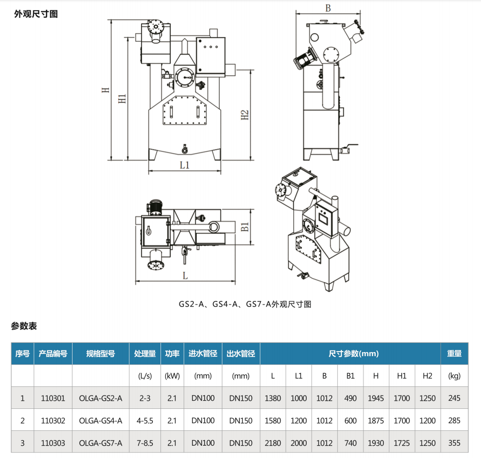 GS2-A型表示自動型,處理量為2L/S,即7.2m3/h;